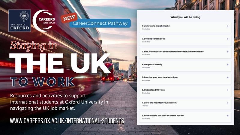 The Careers Service is delighted to have launched a brand-new Staying in the UK to Work pathway on CareerConnect for international students. We hope this pathway will help you access support and resources specifically on navigating the UK job market. The pathway provides a step-by-step guide to the essentials; information on CVs, understanding the UK job market, interview technique, and visa information.